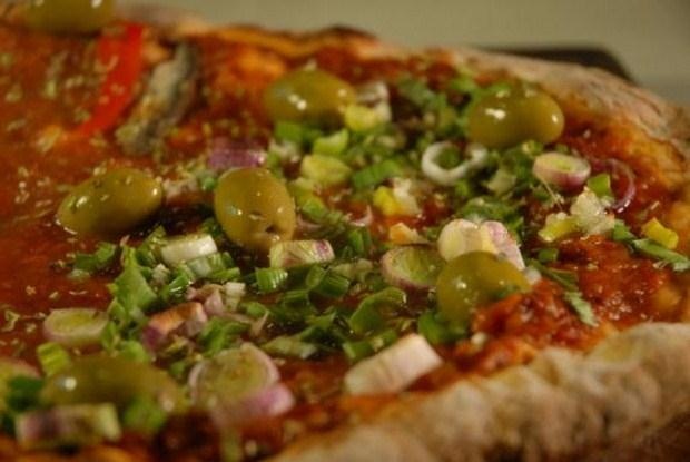 Pizza Ajo al Oleo...Salsa de tomate, ajo picado, cebolla de verdeo, oregano, aceitunas verdes