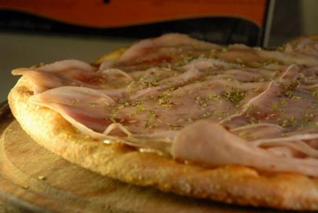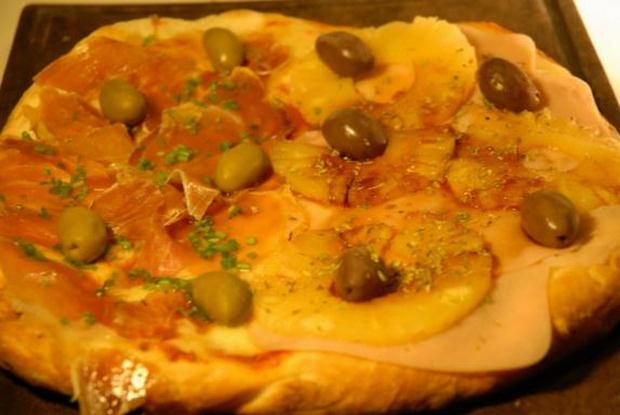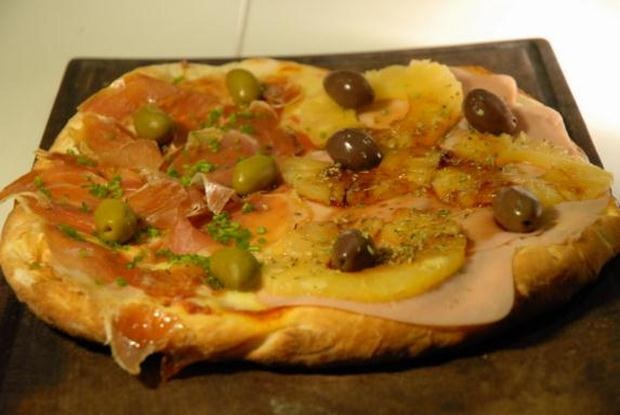 Pizza Ananá...Salsa de tomate, muzzarella, jamon, anana, caramelo liquido y aceitunas negras