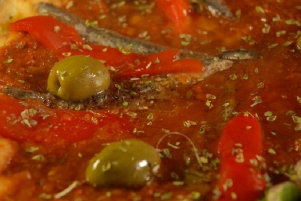 Pizza Anchoas...Salsa de tomate, anchoas, morrón, oregano, aceitunas verdes