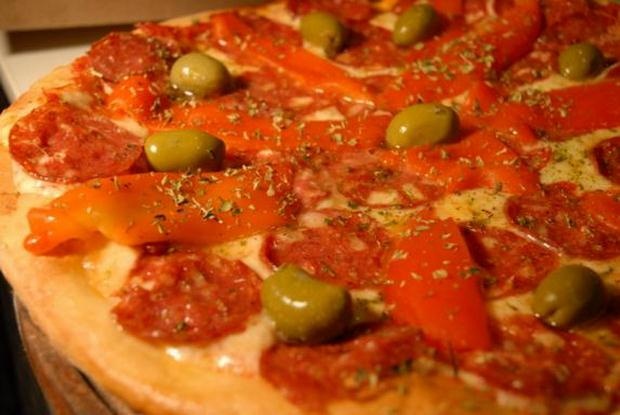 Pizza Calabresa...Salsa de tomate, muzzarella, longaniza calabresa, morrón, oregano y aceitunas verdes