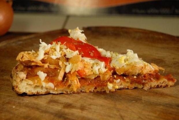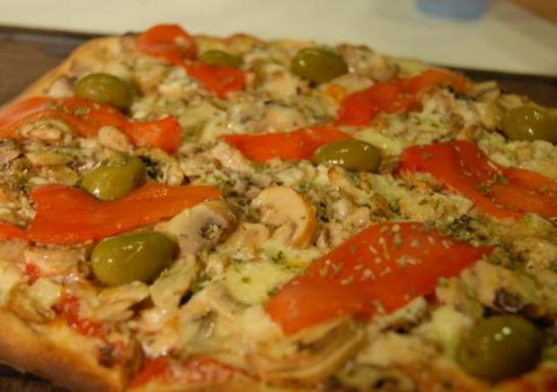 Pizza de Pollo...Salsa de tomate, pollo a la portuguesa, huevo duro, morrón, oregano y aceitunas verdes