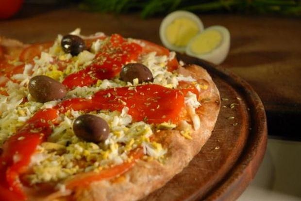 Pizza Palmitos...Salsa de tomate, muzzarella, jamon, palmitos, morrón, huevo duro, salsa golf, oregano y aceitunas verdes